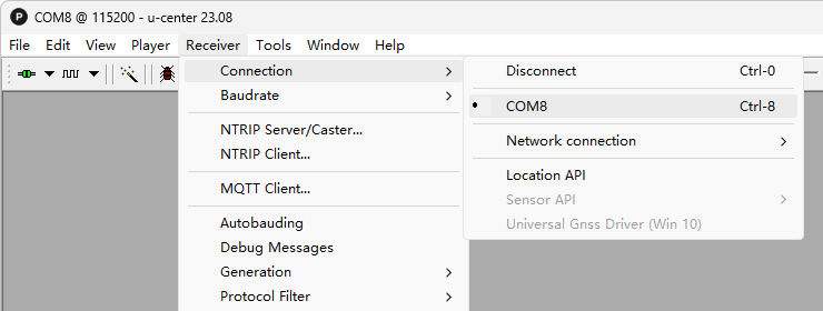 点击“Receiver”—“Connection”,选择EX-1所在的COM端口号。
