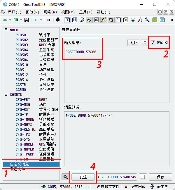 击“自定义消息”,勾选“校验和”,输入消息“PQSETBAUD,57600”,最后点击“发送”。 |