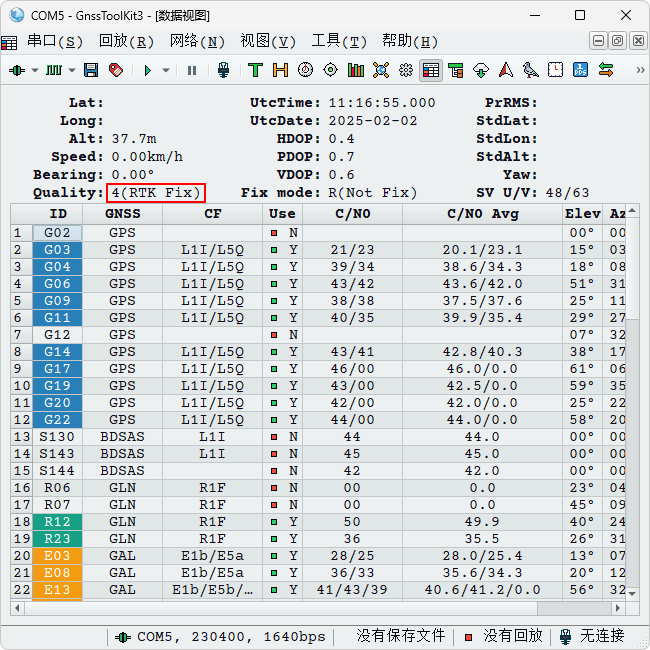 点击“视图”—“数据视图”,当看到“Quality”项目为“4(RTK Fix)”时,说明已获得RTK定位, 此时可达到厘米级精度。