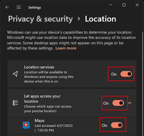 5. Activate "Location Services", "Let apps access your location", and select the programs that are allowed to access your location. |