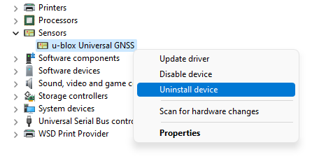 7. To restore to a standard USB device, click "Device Manager - Sensors", right-click on "u-blox Universal GNSS", and select "Uninstall Device". |