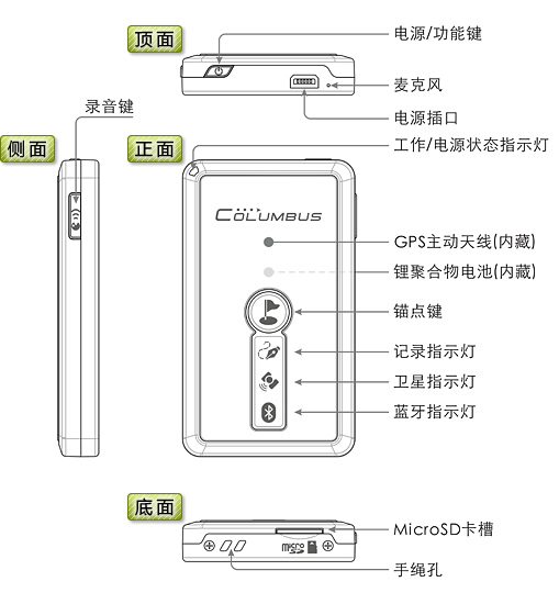 长按该键用于开启和关闭电源,短按该键可在记录+导航,纯记录和纯导航三种模式之间切换。